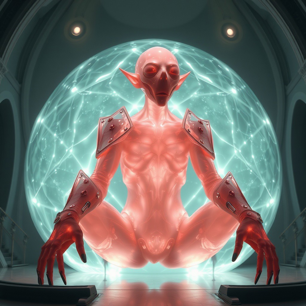 Masterpiece 4 protozoa/humanoid, bioluminescence translucent body, with no ears and no nose, 32k, 16k, 8k, masterpiece, cinematic art, Kaiju bioluminescence translucent armor, sitting in a bioluminescence translucent bubble shape cathedral,