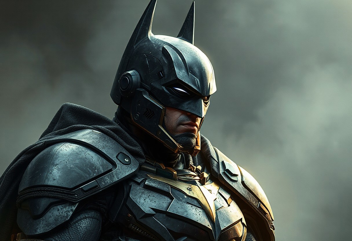 "Create a highly detailed, lifelike depiction of Batman in full Gravitation armor, inspired by Samuel F.B. Morse and Ralph McQuarrie, with a destiny concept art style. The color palette should be grey and gold. Include pulse rifles and a heavy cloak. The image should follow the rule of thirds, with a slightly noisy color scheme. This artwork should be trending on ArtStation with a vibrant 8k resolution."