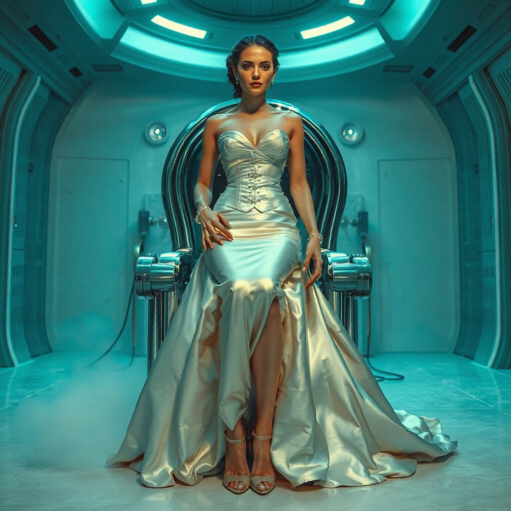 A slender, arrogant rich norvegian bride, dressed in a luxurious, rich fantasy satin wedding gown with a fitted, boned corset and a full, flared skirt, paired with satin high heels, orgasm face. The brainwashing temple electrode, connected to a futuristic superconputer rack. Her hands and ankles are bound to a polished steel throne with massive glass hood by massive steel restraints, accentuating her ultra-thin waist. weird fog from the floor. The scene is set in a sterile, empty chamber, with a glossy mother-of-pearl finish, evoking a sense of futuristic dread. Inspired by the cinematic styles of Ridley Scott, Guillermo del Toro, and H.R. Giger, with a blend of sci-fi and horror elements, this full-body portrait is a masterpiece of cinematic storytelling, shot on a virtual v-raptor XL camera, with a warm, film-grained aesthetic, subtle vignette, and rich color grading, reminiscent of 35mm film, with dramatic, atmospheric lighting, inviting the viewer to immerse themselves in this epic, stunning scene.