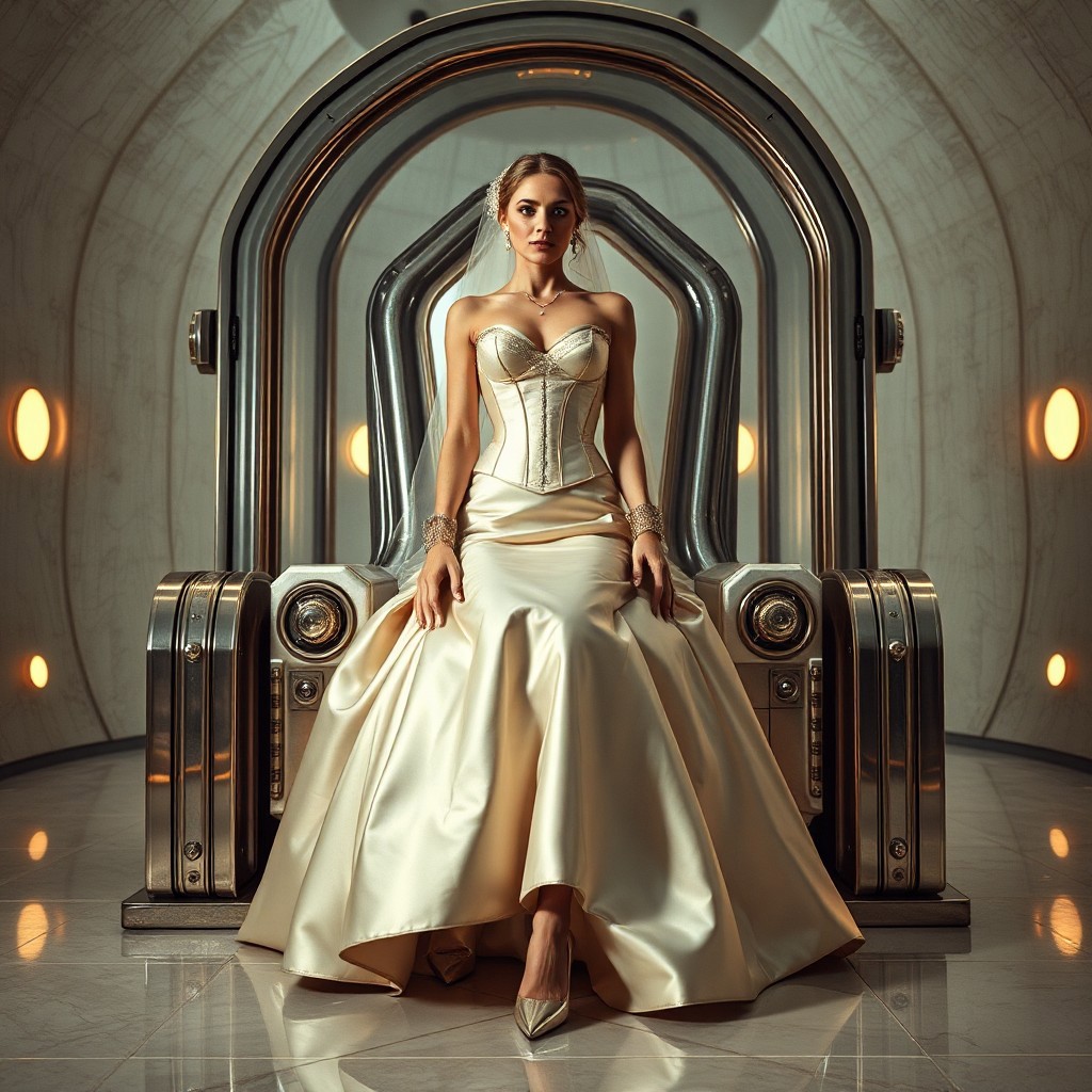 A slender, arrogant rich norvegian bride, dressed in a luxurious, rich fantasy satin wedding gown with a fitted, boned corset and a full, flared skirt, paired with satin high heels, orgasm face. The brainwashing temple electrode, connected to a futuristic superconputer rack. Her hands and ankles are bound to a polished steel throne with massive glass hood by massive steel restraints, accentuating her ultra-thin waist. weird fog from the floor. The scene is set in a sterile, empty chamber, with a glossy mother-of-pearl finish, evoking a sense of futuristic dread. Inspired by the cinematic styles of Ridley Scott, Guillermo del Toro, and H.R. Giger, with a blend of sci-fi and horror elements, this full-body portrait is a masterpiece of cinematic storytelling, shot on a virtual v-raptor XL camera, with a warm, film-grained aesthetic, subtle vignette, and rich color grading, reminiscent of 35mm film, with dramatic, atmospheric lighting, inviting the viewer to immerse themselves in this epic, stunning scene.