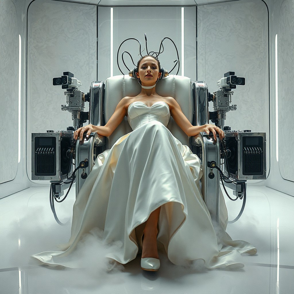 A slender, arrogant rich norvegian bride, reclined in a polished steel restraint fetish chair, dressed in a luxurious, rich fantasy satin wedding gown with a fitted, boned corset accentuating her ultra-thin waist.and a full, flared skirt, paired with satin high heels, orgasm face. The massive electrodes holding her head pressed to the steel restraint chair headrest, cabled to a futuristic superconputer rack. Her hands and ankles are bound to the steel restraint chair by massive steel restraints, weird fog from the floor. The scene is set in a sterile, empty chamber, with a glossy mother-of-pearl finish, evoking a sense of futuristic dread. Inspired by the cinematic styles of Ridley Scott, Guillermo del Toro, and H.R. Giger, with a blend of sci-fi and horror elements, this full-body portrait is a masterpiece of cinematic storytelling, shot on a virtual v-raptor XL camera, with a warm, film-grained aesthetic, subtle vignette, and rich color grading, reminiscent of 35mm film, with dramatic, atmospheric lighting, inviting the viewer to immerse themselves in this epic, stunning scene.