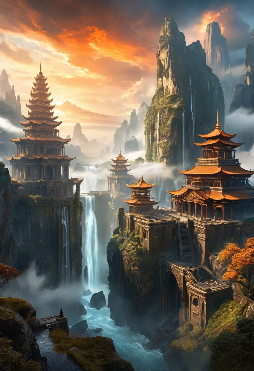 A grand, cinematic environment unfolds with dramatic lighting and monumental scale. Towering cliffs, ancient ruins, and futuristic cities are bathed in atmospheric haze, emphasizing depth and mystery. The scene pulses with dynamic energy — swirling clouds, cascading waterfalls, or drifting embers set against vast skies. Structures, whether fantasy or sci-fi, rise from the terrain with intricate detail, blending the organic and the architectural. A sense of narrative is present, often hinting at adventure, exploration, or epic conflict, all rendered in a painterly style with moody, desaturated tones punctuated by glowing highlights.
