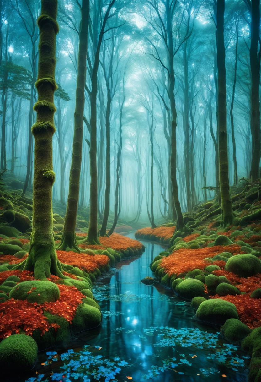 A dreamlike, ethereal forest scene immersed in soft mist and surreal atmosphere. Trees stretch skyward with elegant symmetry, their trunks often forming natural corridors that lead the eye into the unknown. The forest is suffused with glowing light—warm ambers, deep crimsons, or cool cerulean blues—imbuing the landscape with emotional depth and a sense of spiritual reverie. Leaves shimmer like stained glass, and the ground is carpeted in lush moss or fallen petals. The overall tone is meditative and poetic, blending fine art photography with a painterly, mystical sensibility.
