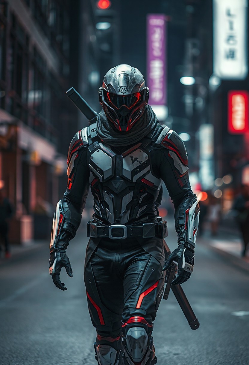 Space Ninja, futuristic, cybernetic sleek armor, high-tech helmet with visor, muscular, black, red, white, color palette, dark city street, night, high-tech laser/steel forearm blades, intricate, menacing walk, powerful, cybernetic aesthetic, high quality, UltraHD