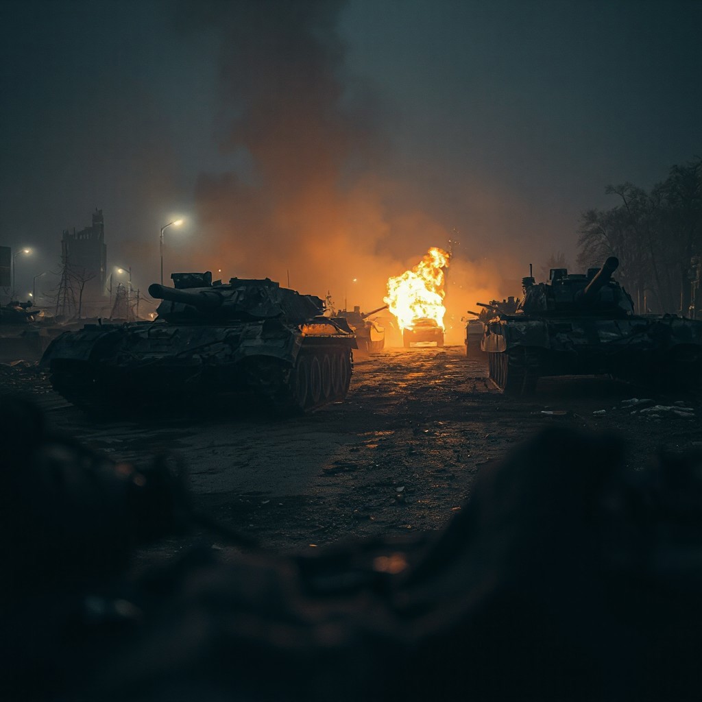 close photo of a infantry fighting vehicle, very low ground point of view, night time, several tanks burning around, everything is destroyed, ruined, dark atmosphere, ground road is dirty and wet, opaque mist. on a background we can see some ruined cityscapers. on the very foreground we see some part of burned tanks.