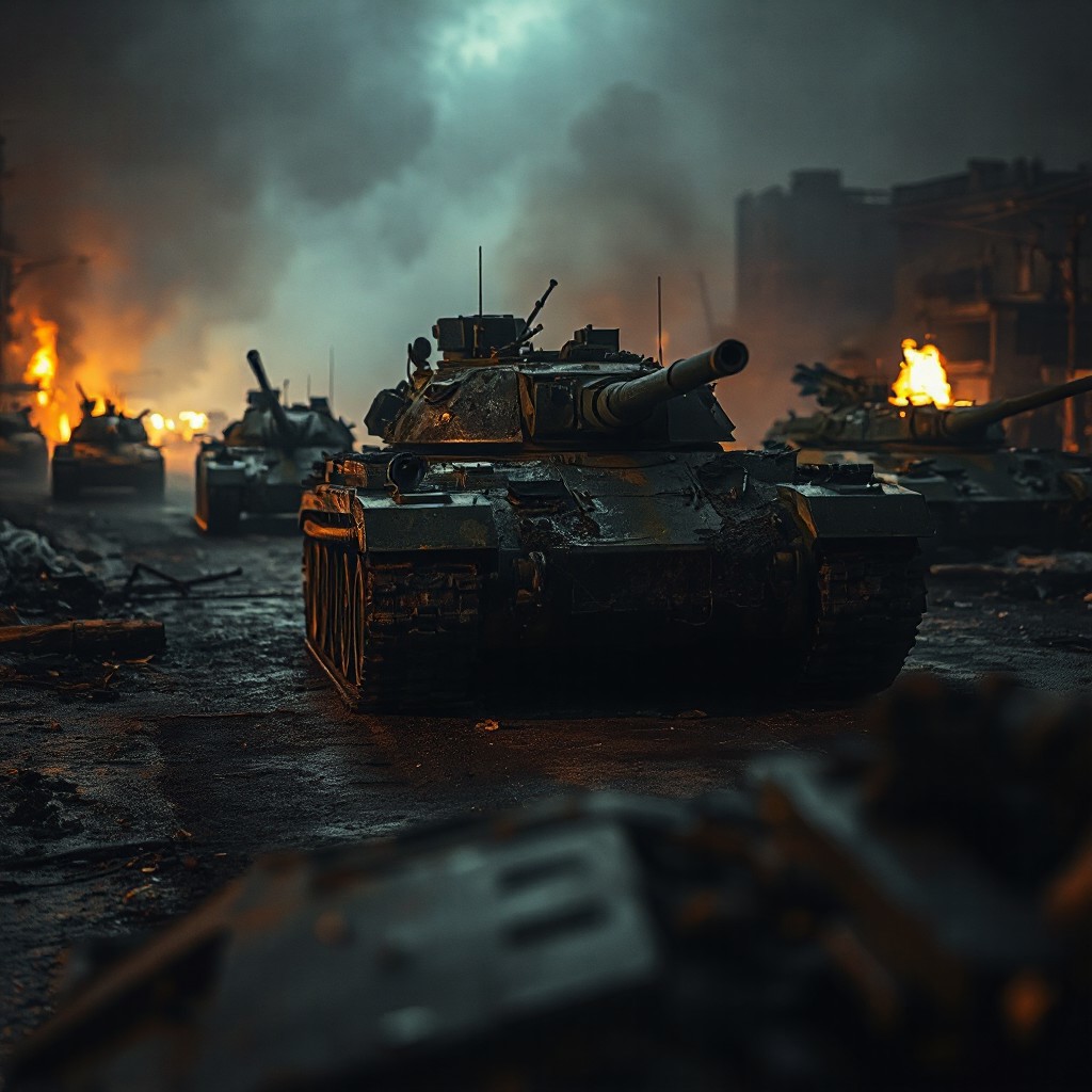 close photo of a infantry fighting vehicle, very low ground point of view, night time, several tanks burning around, everything is destroyed, ruined, dark atmosphere, ground road is dirty and wet, opaque mist. on a background we can see some ruined cityscapers. on the very foreground we see some part of burned tanks.