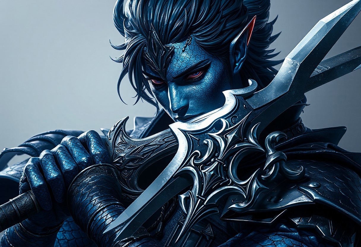 "Create a highly detailed, realistic portrait of a Black Luster Soldier - Envoy of the Beginning with a Divine Sword - Phoenix Blade, inspired by dark souls III and featured on AmiAmi. The character should exhibit a dynamic pose, with blue scales and platinum skin. The design should incorporate elements of video game character design and that of a blacksmith. Consider incorporating dark, mysterious, and cinematic elements, with a focus on sharp, defined features. The final piece should be trending and highly detailed, suitable for a concept art piece."