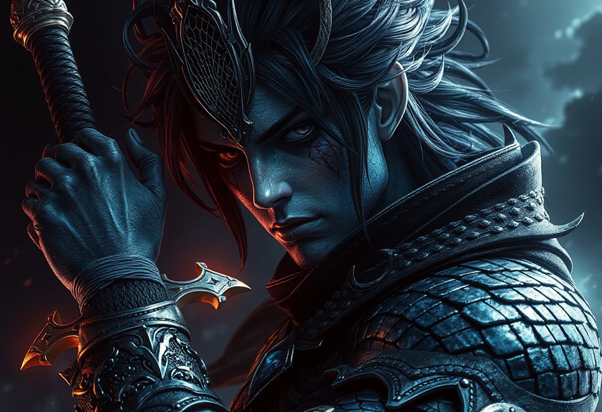 "Create a highly detailed, realistic portrait of a Black Luster Soldier - Envoy of the Beginning with a Divine Sword - Phoenix Blade, inspired by dark souls III and featured on AmiAmi. The character should exhibit a dynamic pose, with blue scales and platinum skin. The design should incorporate elements of video game character design and that of a blacksmith. Consider incorporating dark, mysterious, and cinematic elements, with a focus on sharp, defined features. The final piece should be trending and highly detailed, suitable for a concept art piece."
