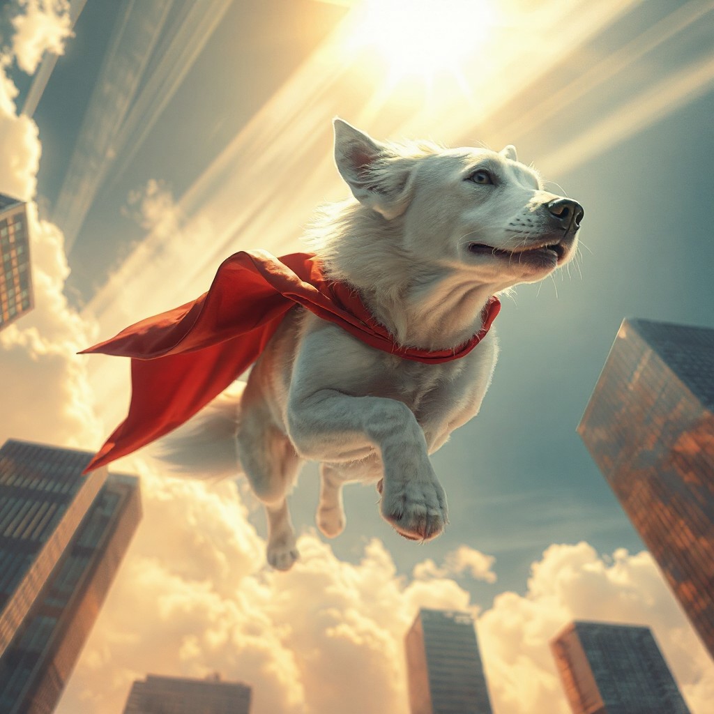 (film_emulsion) A hyper-realistic digital painting of Krypto the Superdog, depicted as a majestic white canine flying through the sky. Viewed from a dramatic worm’s-eye angle, his red cape flaps heroically in the wind. His muscular form and pristine white fur gleam in the sunlight as he soars with focused intensity. Towering skyscrapers loom in the background, emphasizing his altitude and scale. The sky is vibrant with streaks of clouds and golden sunlight breaking through, capturing the essence of a true airborne protector.
