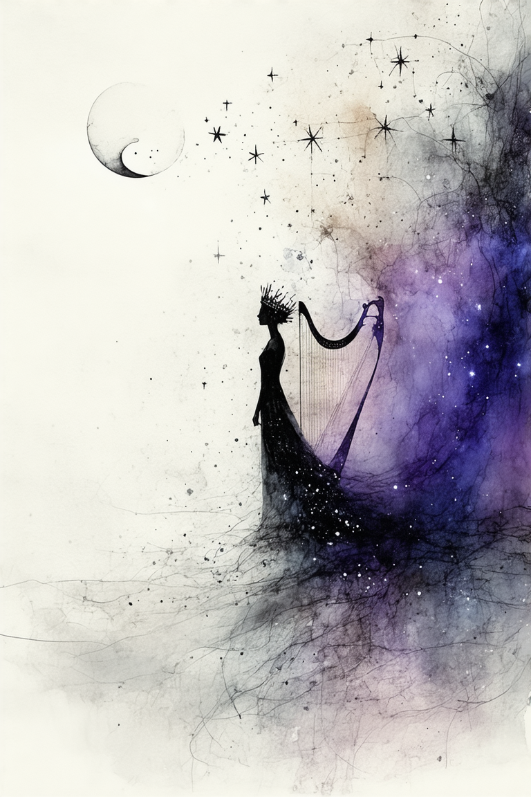A solitary figure, rendered in a single fluid line, drifts through a dreamlike stage where constellations morph into masks. Surrealist linework à la Picasso meets Chagall’s whimsy, with bold black-and-white contrasts softened by pastel washes. Velvety shadows and gossamer fabrics frame the scene; a crescent moon crown dissolves into starry threads. Foreground: intricate, continuous contours; midground: symbolic props (harps, hourglasses); background: nebulous constellations. Soft backlighting highlights the figure’s introspective gaze. Ethereal, theatrical, blending myth and avant-garde minimalism in a silent performance between sleep and awakening.
