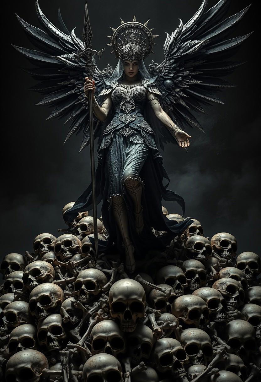 hyper-realistic, photography, highly intricate detailed, female warrior, floating above a bed of skulls and bones, gothic style, baroque, surreal, masterpiece, low-angle, high contrast, pitch black