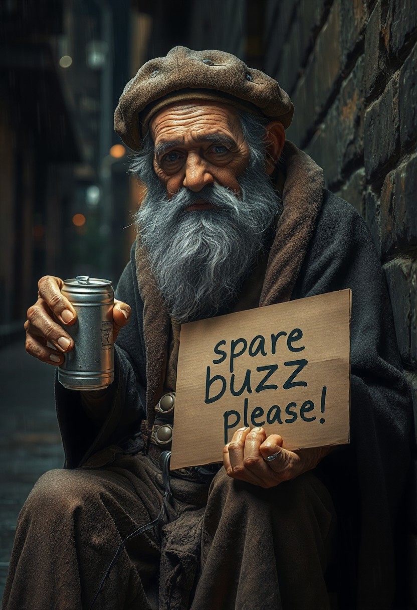 Realistic, high quality, great anatomy accurate, 1man, fuzzy beard, grey beard, wrinkly face, dirty face, tired face, ragged robe, dirty clothes, dirty hat, berret hat, ragged long pants, sitting, holding empty can, can with word "BUZZ" on, cardboard saying "spare buzz please", Night time, raining, dark alley