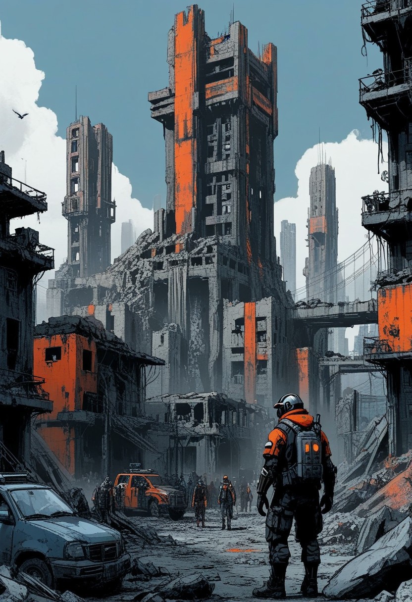 - A dystopian cityscape with towering ruins and high-tech structures - Characters in rugged, utilitarian clothing with futuristic armor and gear - A color scheme that uses cool blues and greys for the tech, warm oranges and reds for the human elements - A technique that combines digital rendering with hand-drawn elements - Themes of survival and adaptation in a harsh new world - A palette that uses muted tones with occasional bright highlights - A composition that leads the eye through the scene, highlighting key elements illustration