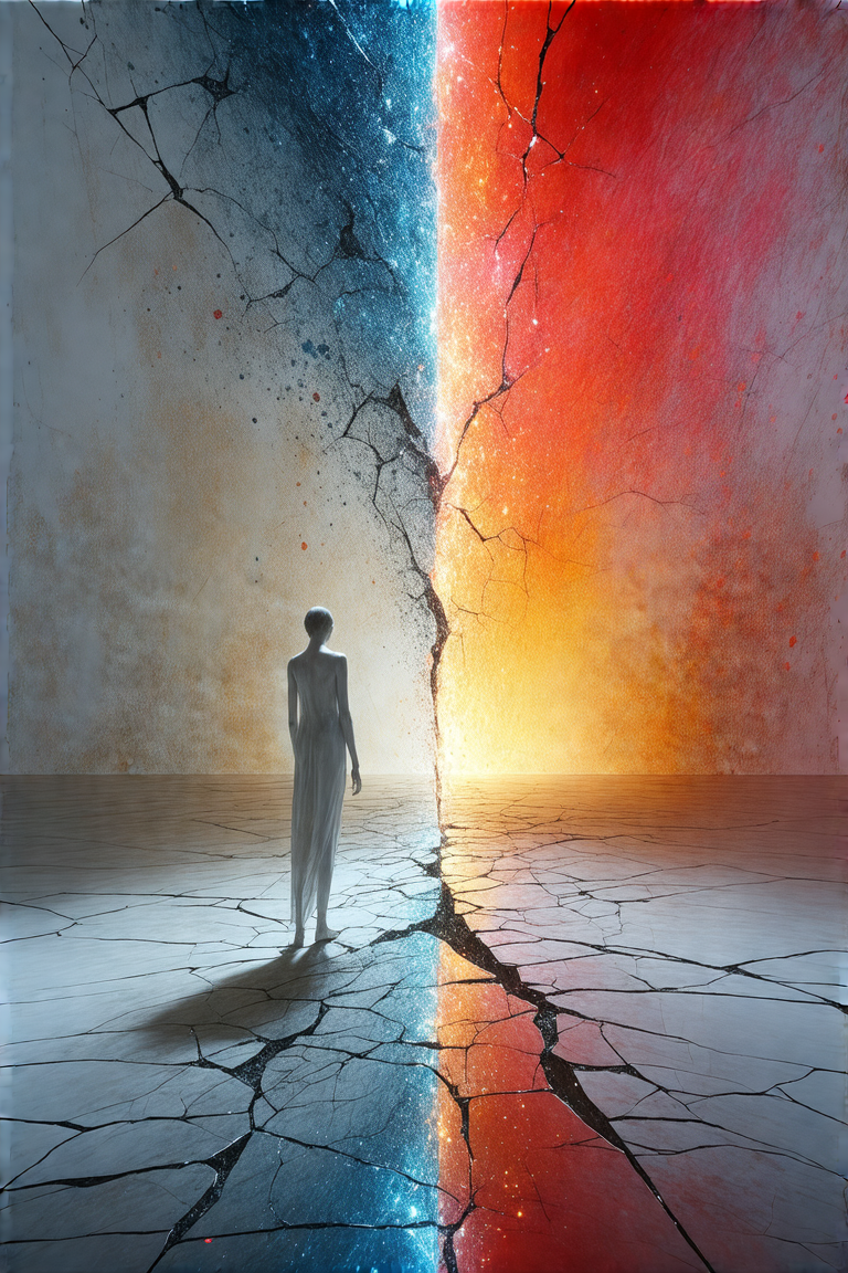 A lone figure emerges on the left, limbs dissolving into fractured geometric abstraction on the right, bisected by a vertical split that bleeds luminous cracks. Set in an ethereal void, the foreground prioritizes hyper-detailed textures—porcelain skin melting into jagged metallic shards. Blends Salvador Dalí’s surrealism with Gerhard Richter’s abstract tension: muted earth tones clash against neon splatters under dual lighting—soft gradients meet stark, angular shadows. Tactile contrasts: silk robes unravel into wire mesh, fingertips graze liquid mercury. Mood: surreal tension, whispered secrets in static. Symbolic details: a fading hourglass, a mirror shard reflecting nothing.