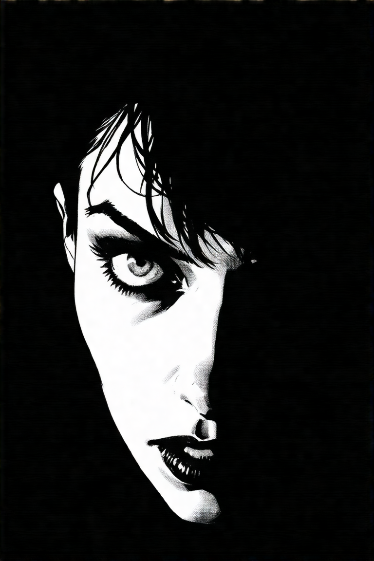 Intense close-up from a slightly low angle: a woman arches her back dramatically, wide eyes piercing the shadows of a gritty noir room. Masterful Frank Miller Sin City style: extreme high-contrast black and white chiaroscuro, harsh graphic novel linework. Tense atmosphere crackles as stark light sculpts her form against oppressive darkness, focusing on her captivating, raw gaze.