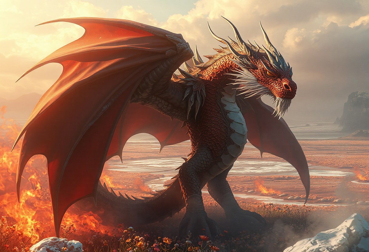 "Create a captivating, high-definition digital illustration, inspired by the golden ratio, featuring a Dragon Queen with a tragic backstory. Set the scene on a land of frozen flames, with a looming, long-caped creature in a red, brown, and white color scheme, inspired by Abidin Dino's art style. The Dragon Queen, who is a BBW, should be crowned, with delicate features and a pointed chin. The image should be featured on Art Station and AmiAmi, with a dynamic, dramatic, cinematic lighting and an arthouse feel reminiscent of Henri Cartier-Bresson's work. Consider incorporating elements such as distant realistic mountains, an ocean, and a field of flowers, rendered using Octane, Maya, and Blender, with a 2D game art or concept art feel."