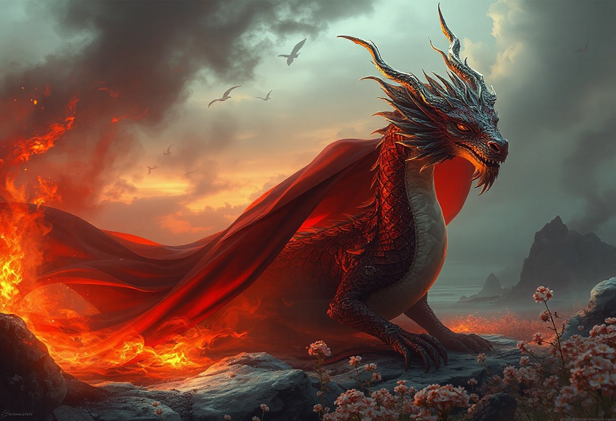 "Create a captivating, high-definition digital illustration, inspired by the golden ratio, featuring a Dragon Queen with a tragic backstory. Set the scene on a land of frozen flames, with a looming, long-caped creature in a red, brown, and white color scheme, inspired by Abidin Dino's art style. The Dragon Queen, who is a BBW, should be crowned, with delicate features and a pointed chin. The image should be featured on Art Station and AmiAmi, with a dynamic, dramatic, cinematic lighting and an arthouse feel reminiscent of Henri Cartier-Bresson's work. Consider incorporating elements such as distant realistic mountains, an ocean, and a field of flowers, rendered using Octane, Maya, and Blender, with a 2D game art or concept art feel."