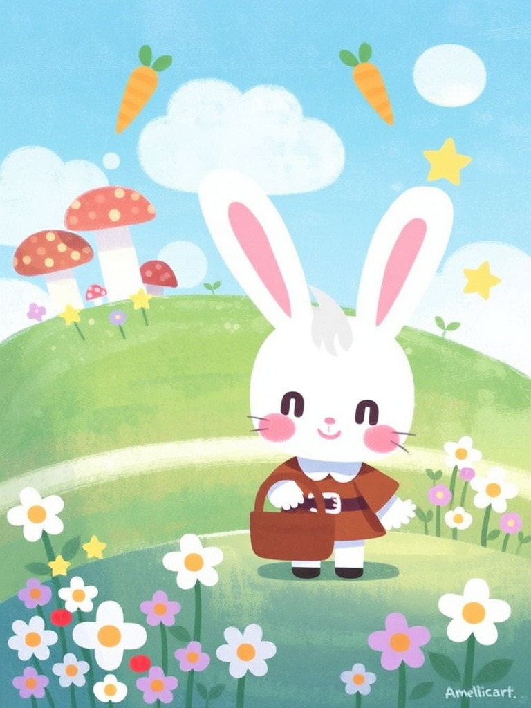 AMELICART. masterpiece, best quality,high detailed. A vibrant digital illustration depicts a quaint fantasy scene featuring a cute, anthropomorphic white bunny character with rosy cheeks. The plush bunny stands on a lush green hill adorned with flowers, holding a wooden pail filled with carrots. The backdrop is a cheerful blue sky with fluffy white clouds, dotted with whimsical shapes: carrots, mushrooms, and a star. The bunny's outfit, a rustic brown tunic, adds charm to the scene’s gentle, inviting ambiance. This cute art style suggests a playful, peaceful moment.