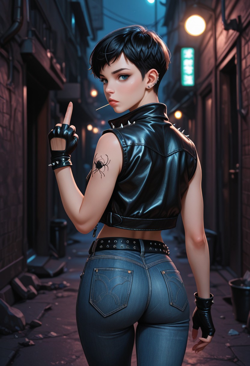 from behind, solo, 1girl, black hair, very short hair, pixie cut, piercings, blue eyes, looking back at viewer, toothpick in mouth, black leather jacket, sleeveless jacket, spikes, denim jeans, black fingerless gloves, spider tattoos, athletic, black belt, small hips, tight butt, standing, middle finger, alley, night, exterior, spotlight, depth of field, high_quality, highres, detailed_eyes, beautiful, detailed, masterpiece, best quality, absurdres, 8k, HDR,