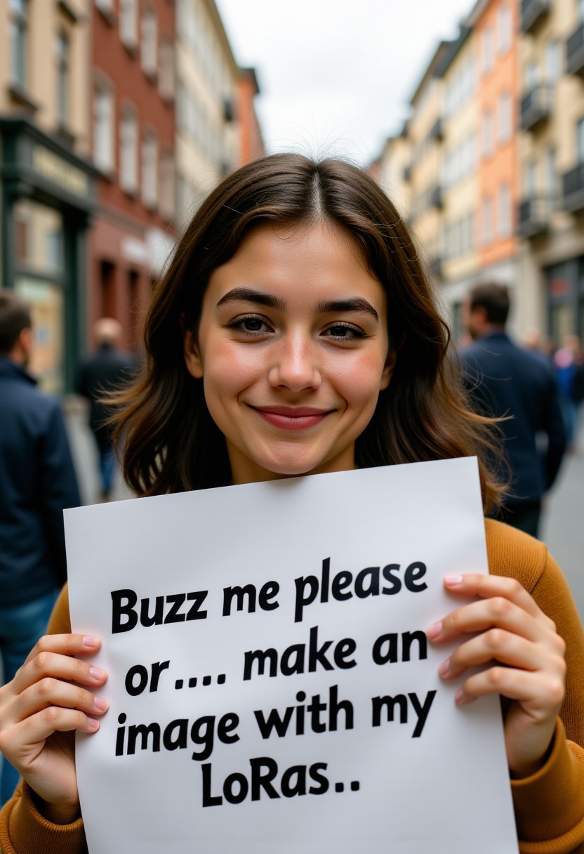 Close-up portrait of a young woman who winks holding a sign that says "Buzz me please, or …. make an image with my LoRas..." in a bustling city street, photorealistic, soft diffused daylight, slight graininess to mimic a low-quality smartphone camera, modern streetwear style, warm tones, soft focus background with blurred urban elements, candid expression, avoid glossy or overly smooth skin, prioritize realistic skin details over airbrushed perfection