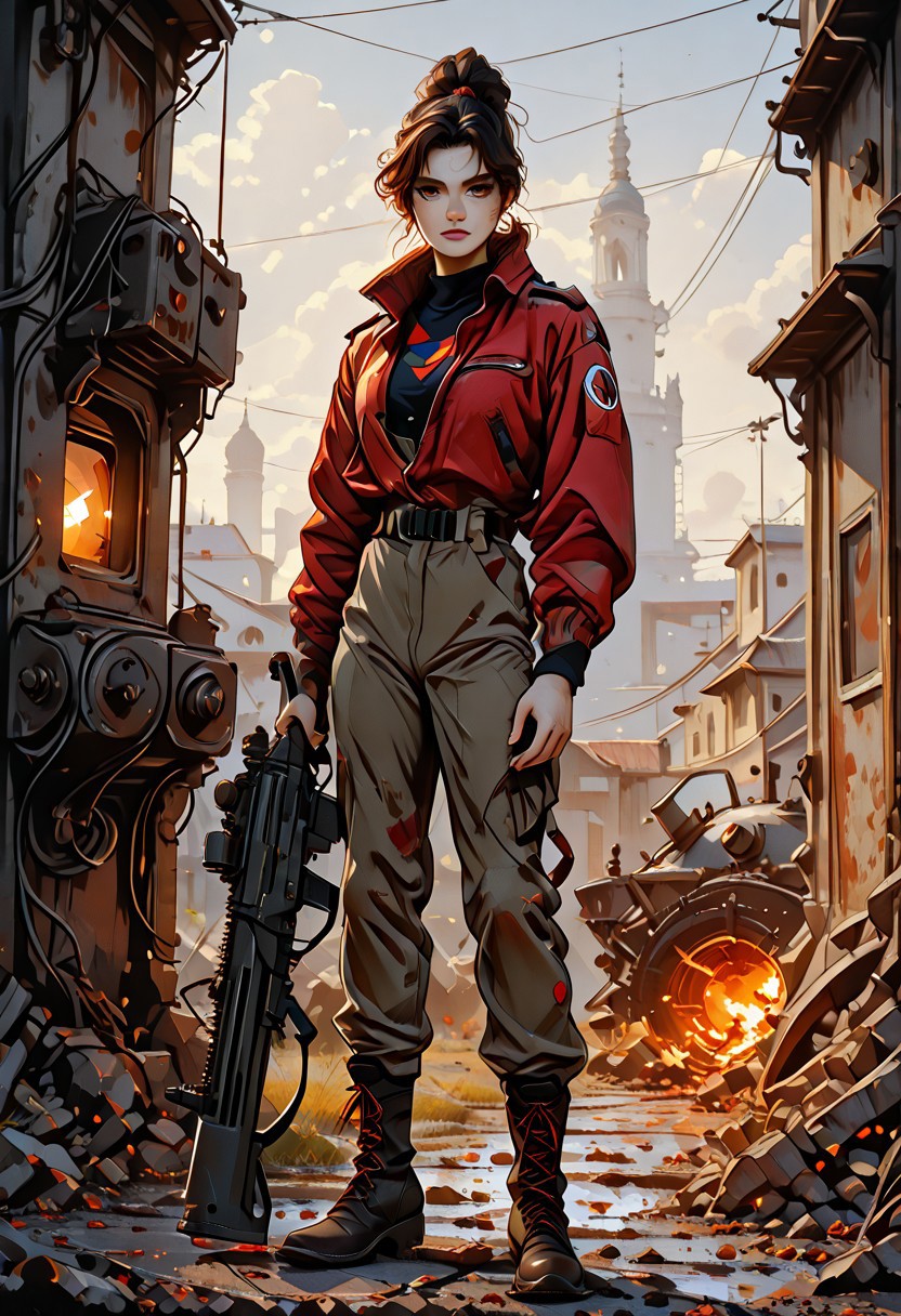 masterpiece, Shinkaistyle, pinkretroanime, retro art, Cyberpunk Style, cyberpunk, science fiction, hi tech, future tech, neon, (Cybernetics:1.25), (Neon Cityscape:1.4), (lineless:1.5), smooth edges, (lighten the face:1.5), tall body, slender body, fit body, long legs, masterpiece, UHD, 8K, high res, high detailed, best quality, amazing quality, (Digital illustration, side view, Jakub Rozalski style, post-apocalyptic battlefield, painterly realism) A lone female soldier stands guard amid a war-torn field, her back to the viewer. She wears a weathered military uniform—jacket, boots, cap—with a rifle slung over her shoulder and her hair tied in a tight ponytail. Her stance is calm yet resolute, framed against the chaos. In the foreground, a tiger crouches low in the grass, its gaze fixed on the smoky horizon. Behind her, a massive armored vehicle looms—rusted, mechanical, adorned with faded red crosses on its turret—its machine gun raised above the barbed wire-laced field. Scattered debris and distant figures shrouded in fog complete the scene, while dark trees line the edges of the smoky, desaturated background. (Muted earth tones, cinematic haze, painterly brushwork, high narrative tension, moody atmosphere) The artist’s signature marks the corner, grounding the piece with personal authorship.