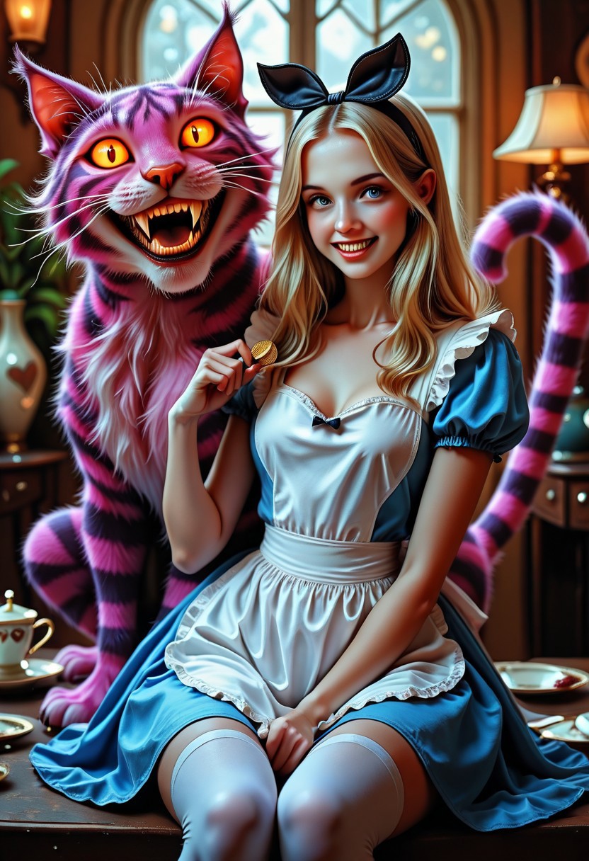 UnderlandAlice, Score 9, Score 8, Score 7, Masterpiece, High Quality, Good Quality, Latest Model, High Resolution, alice in wonderland, blonde hair, short blue dress, white apron, white thighhighs, BREAK Holding Cheshire Cat, stroking Cheshire Cat, cat with large fangs and creepy grin, fantasy horror, studio ghibli nightmare, neil gaiman aesthetic, soft shadows, cinematic lighting, masterpiece