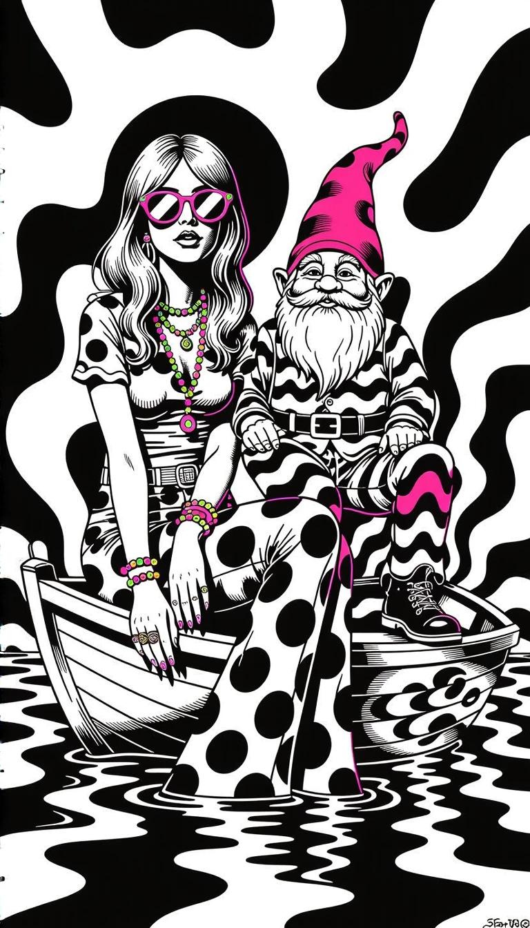 The style of Stanley Mouse’s 60s counterculture psychedelic Poster artwork — merging trippy visual storytelling with ornamental, hand-drawn energy, 2D comic psychedelic distortions, and bold linework of (A anaglyphy effect hippie woman wearing outlined 70’s Woodstock clothing, sitting next to a gnome on a boat before a trippy black‑and‑white‑stripe dimension. hot‑pink highlight piercing through crevices ⸻ Core Style Terms: • Psychedelic rock poster surrealism • Hand-drawn 3D-like neon fantasia • Comic grotesque elegance • Mind-bending cosmic design
