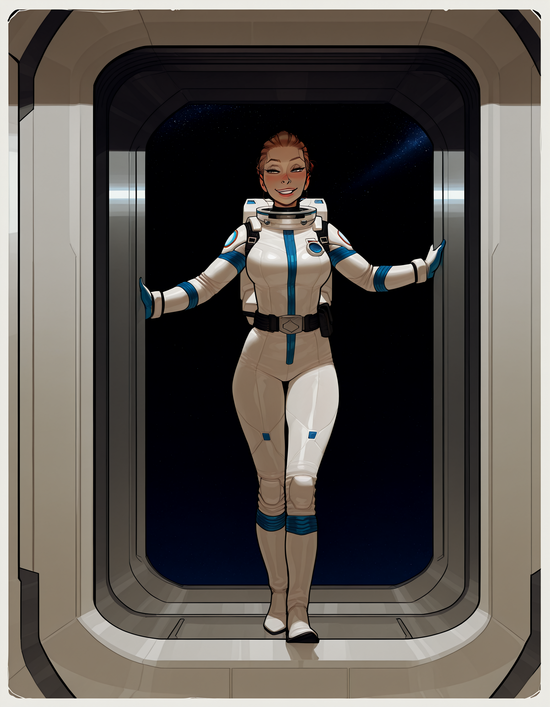 IllustriousQual, detailed face, tall woman, milf, solo, thick build, long brown hair, hair pulled back, medium breasts, long legs, (muscular thighs:0.3), flirty smiling, wearing a spacesuit and helmet, on a space station, posing in an airlock, view of blue planet out of window, <lora:incaseIllustrious:0.8> incase style,