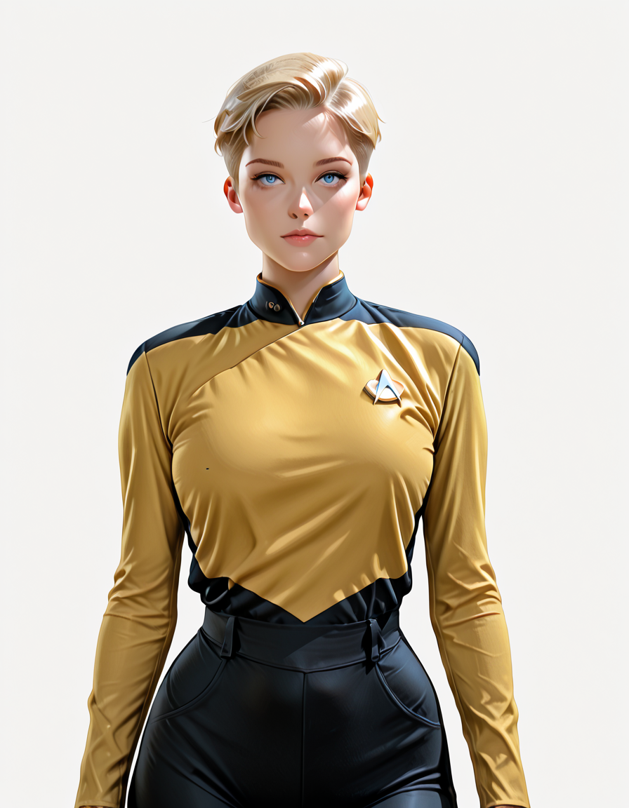 8K,absurdres,very aesthetic,masterpiece,highly_detailed,best_quality,newest,1girl,blonde,black pants,simple background,<lora:Gentlemans_Cut_ILLUSTRIOUS_Classic_Hairstyle:1>,facing viewer,blue eyes,very short hair,yellow uniform,<lora:TNGILLV1:1>,wide hips,realistic,