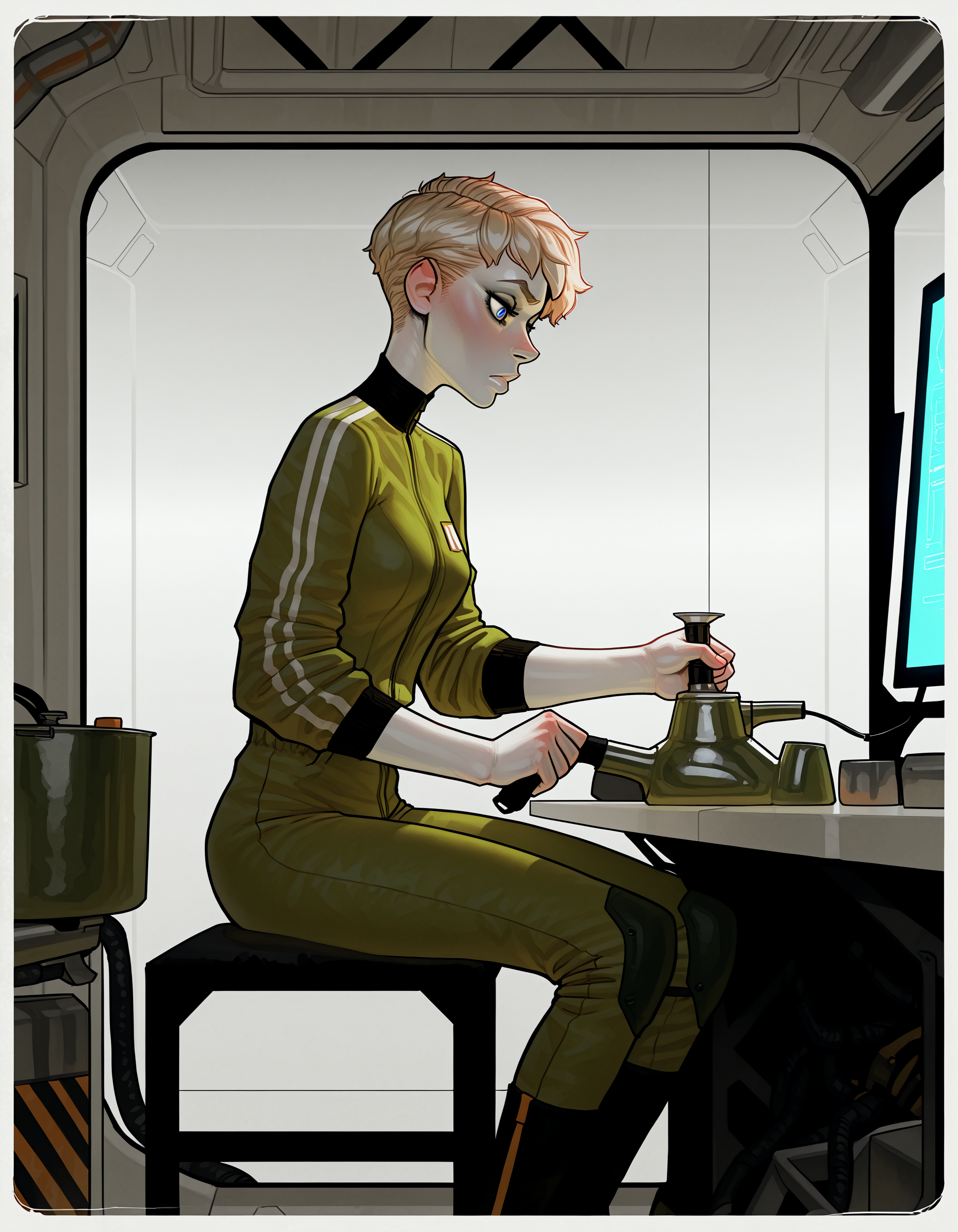 IllustriousQual, detailed face, very tall woman, solo, very short blonde hair, pixie cut, blue eyes, pale skin, small breasts, very long legs, determined expression, on a space station, in the engineering spaces, wearing a baggy green coverall, sitting at a workbench, welding, from side, <lora:incaseIllustrious:0.8> incase style,