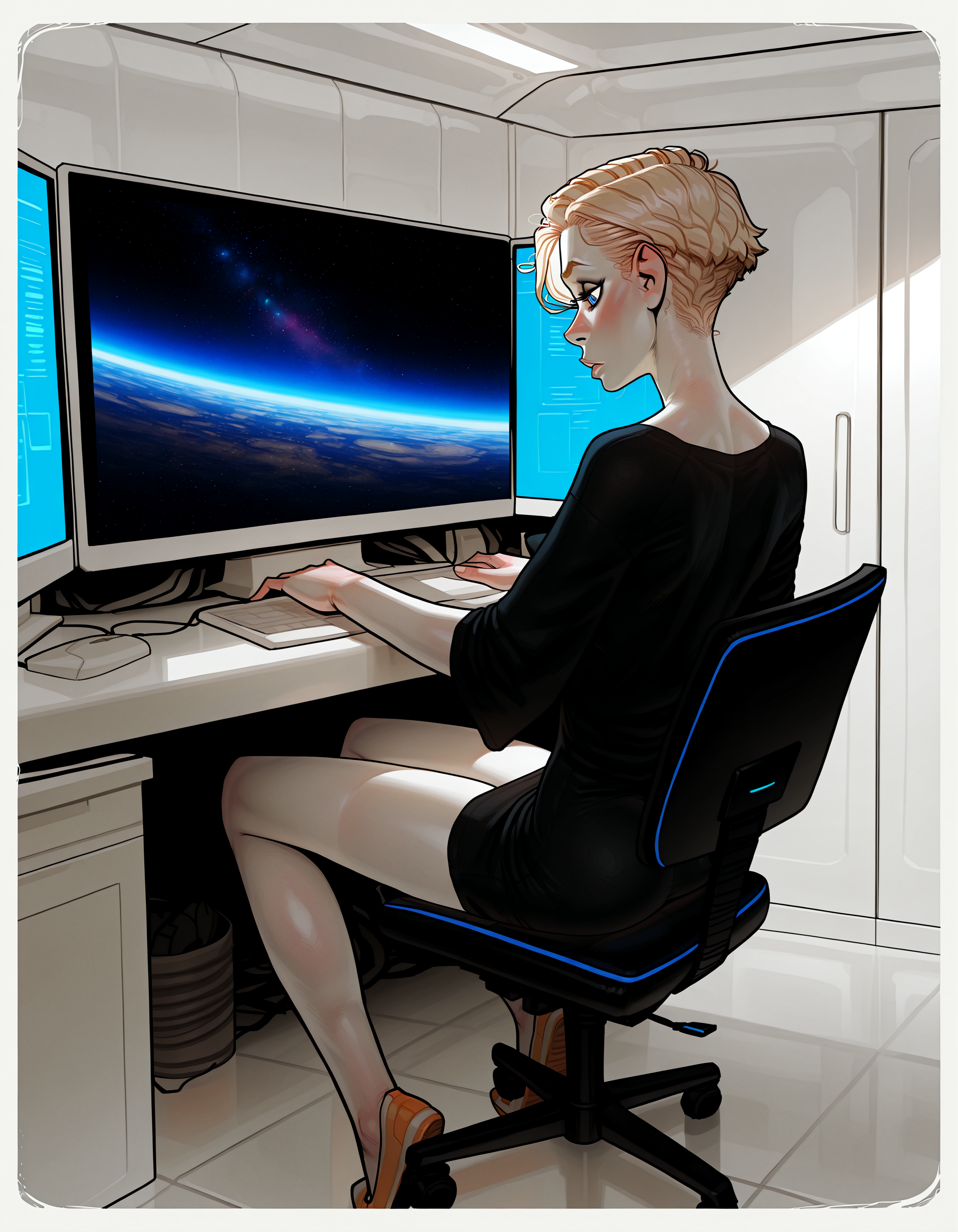 IllustriousQual, detailed face, very tall woman, solo, very short blonde hair, pixie cut, blue eyes, pale skin, small breasts, very long legs, on a space station, wearing along oversized t-shirt, sitting, working at a computer, from behind, <lora:incaseIllustrious:0.8> incase style,