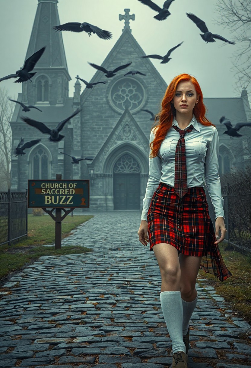 (masterpiece, ultra-detailed, high-resolution, cinematic lighting, photorealistic). A hot redhead woman in red plaid skirt, white long sleeve button down shirt, uniform red plaid tie that matches skirt, knee high white socks, sexy voluptuous body, beautiful face, is walking on cobblestone path in front of an old gothic church, ravens flying around:0.8, mystery and dark:0.8, horror, foggy, old sign on pathway to church says “CHURCH OF THE SACRED BUZZ”:2.5,