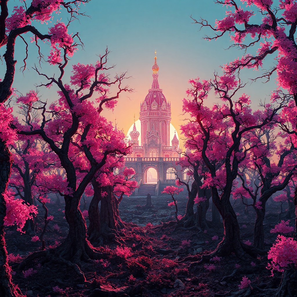 a pink crystal palace sitting in the middle of a twisted diseased forest, light emanates from the palace coloring the trees around it with a pink hue, the sun sets behind the palace