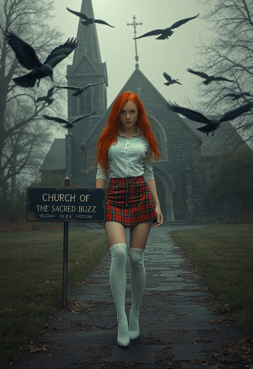 (masterpiece, ultra-detailed, high-resolution, cinematic lighting, photorealistic). A hot redhead woman in red plaid skirt, white button down shirt, knee high white socks, sexy body, cute face, is standing in front of an old gothic church, ravens flying around:0.8, mystery and dark:0.8, horror, foggy, old sign on pathway to church says “CHURCH OF THE SACRED BUZZ”:2.5,