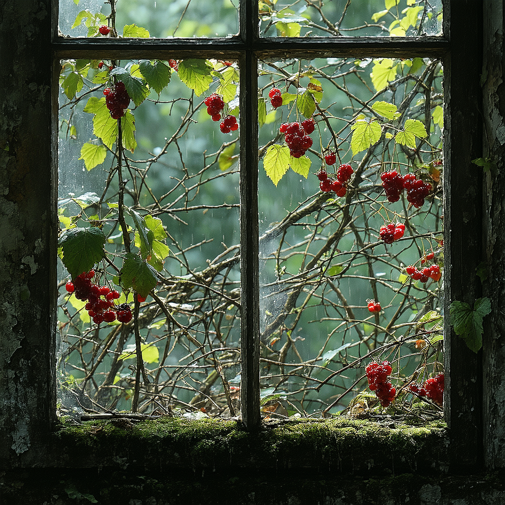 Low-angle intimate view through dust-streaked antique window: gnarled branch shadows dance across dew-kissed velvety moss and tangled crimson raspberry canes. Focus: intricate shadow-play. Cinematic natural lighting by Emmanuel Lubezki, shallow depth of field. Palette: desaturated greens, umber, deep crimson, illuminated by soft silver overcast light. Key textures: weathered wood grain, damp moss, translucent leaves. Atmosphere of serene solitude, quiet introspection.