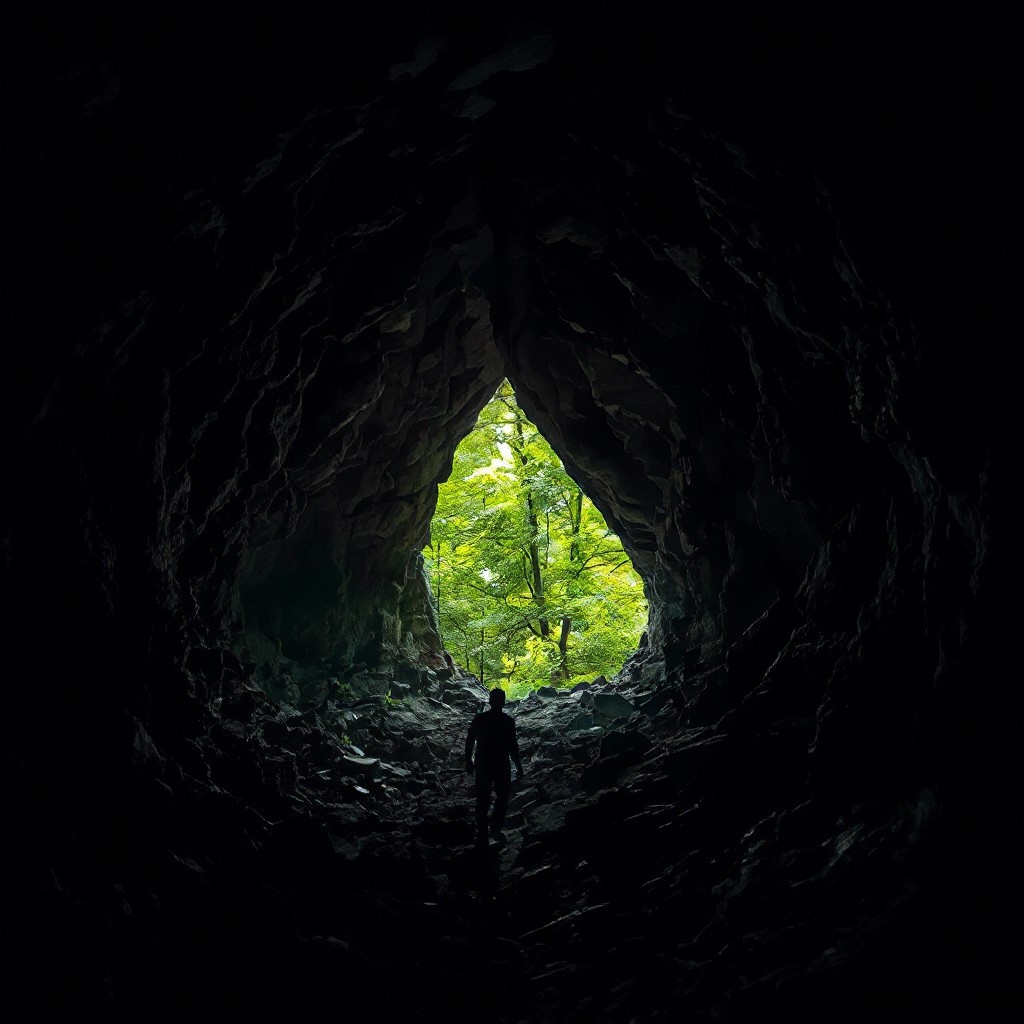 Dark, jagged cave interior with protagonist slowly advancing toward a small opening revealing lush green foliage outside, harsh contrast between shadowy confinement and bright natural world representing hope and escape.