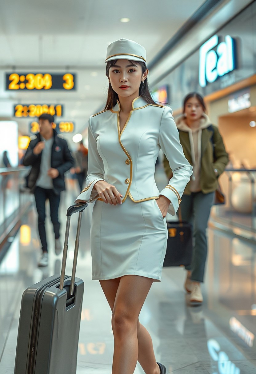 DSLR-style, glamorous and elegant 26-year-old Korean woman with flawless pale skin and natural glow. Subtle facial features, parted lips, soft expression. Masterpiece, ultra high-res. <lora:NOOB_vp1_detailer_by_volnovik_v1:1> realistic skin texture with visible pores under soft lighting, porcelain-like translucency, full body composition. She is wearing a form-fitting white uniform reminiscent of a high-class airline crew, featuring gold-trimmed cuffs and a tailored short skirt that highlights long legs. A matching peaked cap rests neatly on her styled hair. Her blouse is sharply cut with a deep neckline, subtly suggesting curves underneath. The setting is a sleek, modern airport terminal or luxury shopping mall. Reflections bounce off the translucent flooring beneath her feet, revealing faint outlines of the level below. A premium-looking rolling suitcase stands beside her, reinforcing the impression of poised mobility. In the background, casually dressed passersby move through the brightly lit space — one in a dark jacket and jeans, another in a cream-colored hoodie and pants. Illuminated signage with numbers and the glowing brand logo of a tea shop add urban context. Capture the visual tension between stillness and motion, elegance and suggestion. Focus on textile texture, fabric tension, floor reflection, and ambient light realism.