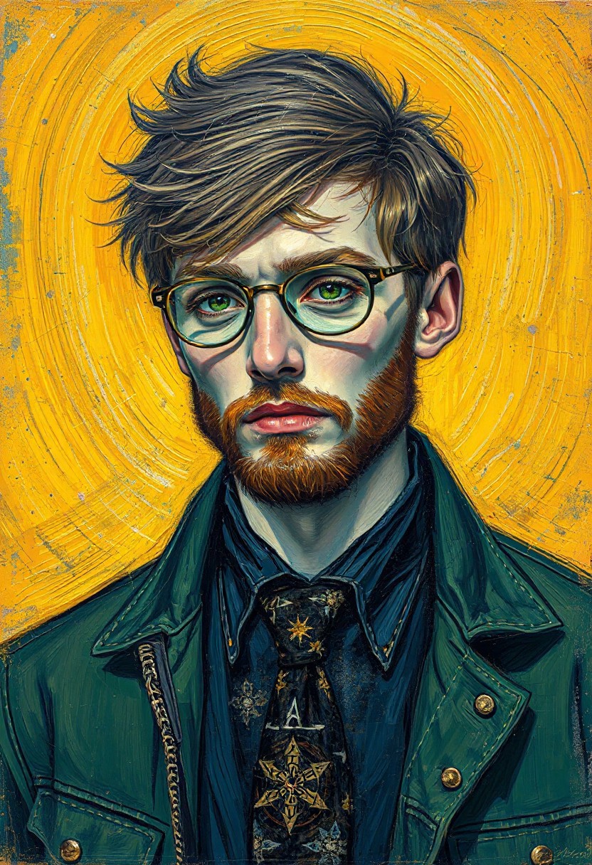 A vibrant post-impressionist portrait in the style of Vincent van Gogh, featuring [young man with dark blond grunge hairdo, aviator glasses, green eyes, Slavic appearance] wearing [green jacket, black shirt, tie with Rorschach test], with expressive brushstrokes, swirling background in warm yellows and deep blues, thick textured oil paint, visible impasto technique, starry night sky elements, masterpiece