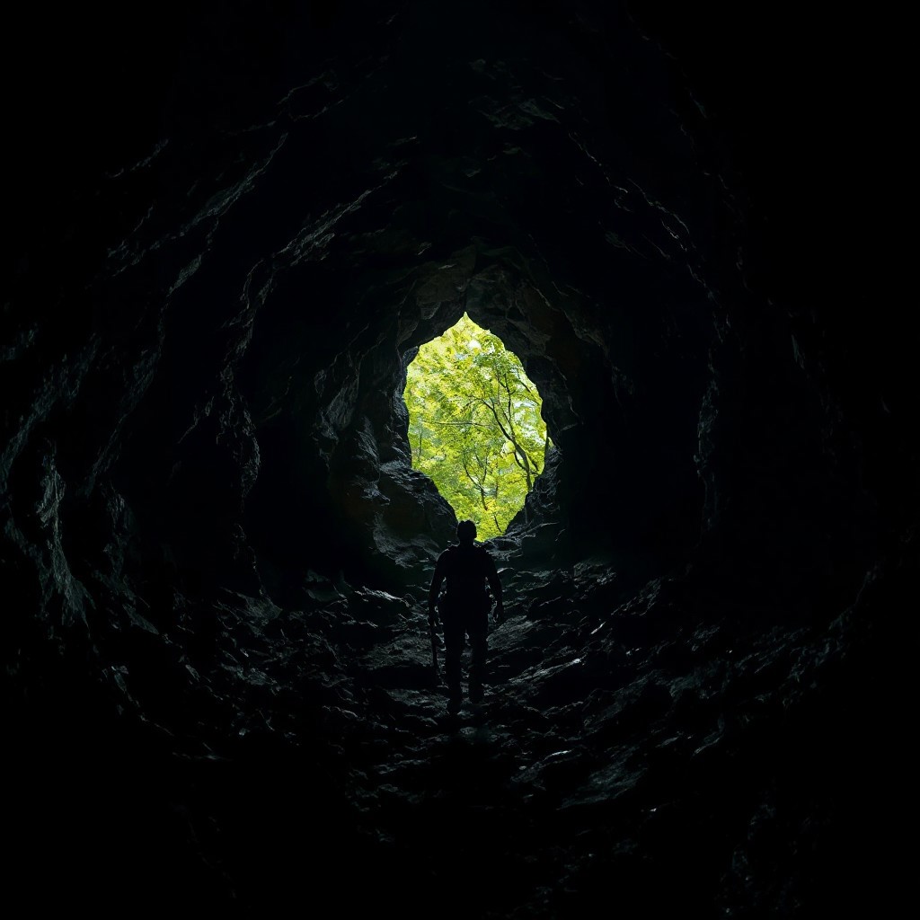 Dark, jagged cave interior with protagonist slowly advancing toward a small opening revealing lush green foliage outside, harsh contrast between shadowy confinement and bright natural world representing hope and escape.
