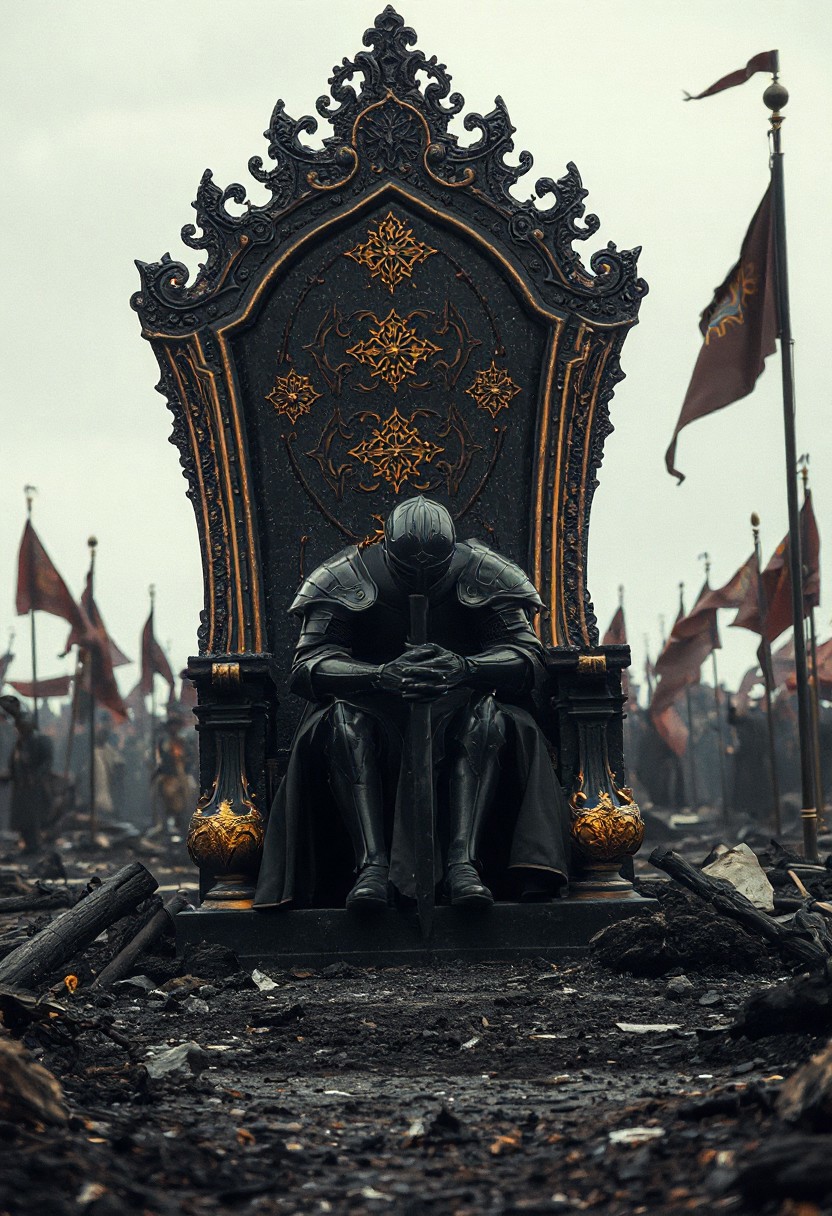 “A dark knight sits motionless on a majestic black-and-gold throne, head bowed, face buried in his hands. His armor is obsidian-black, with a texture like polished dark marble — heavy, regal, but broken by grief. Around him: ruins and ashes stretch across a dead, silent battlefield. Burned flags, shattered stone, and scorched remains flank the throne. The sky is overcast, casting a pale, cold light. The air is filled with floating ash. The knight looks like he’s asking: ‘What did I do wrong?’ Cinematic 4K, ultra-detailed, melancholic, dark fantasy, still frame, emotional tension, golden accents, chiaroscuro shadows.”