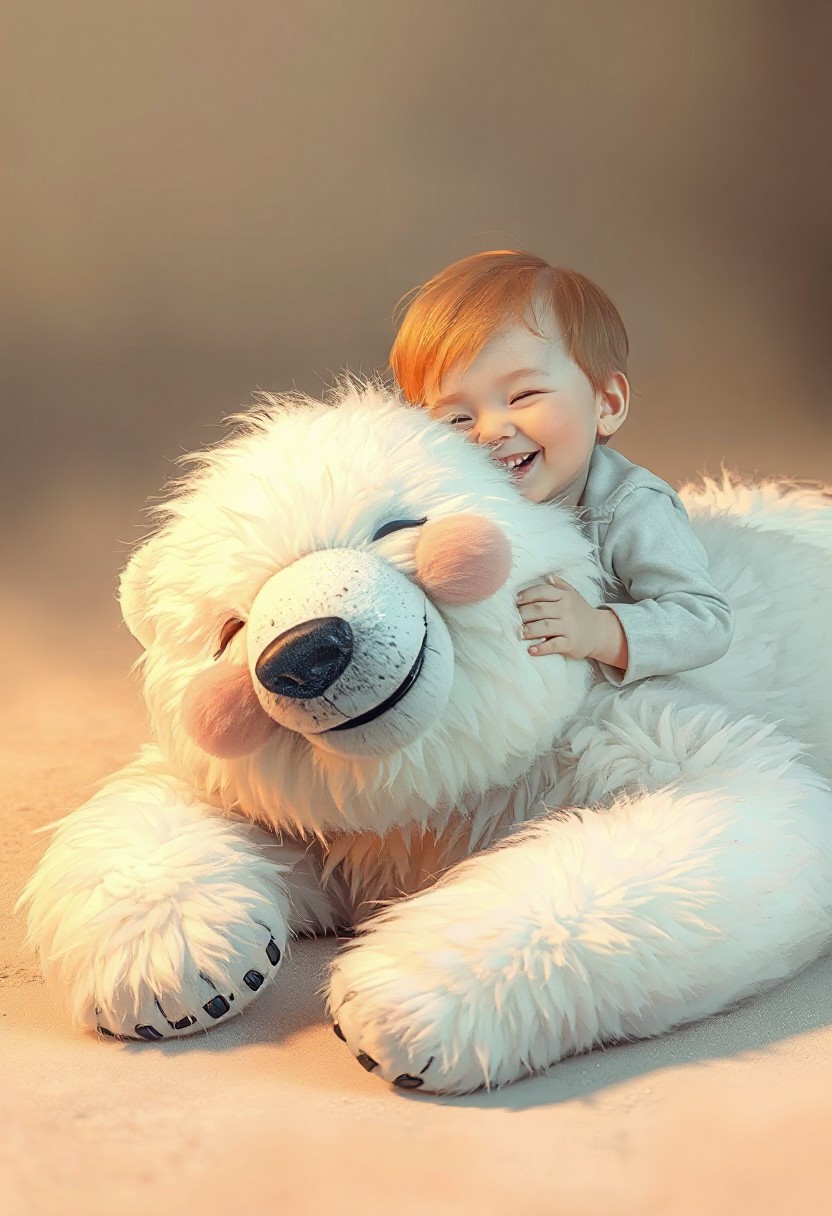 An amorphous, fluffy polar bear lying on the ground, looking relaxed and almost lifeless but with the beginning of a smile on its face, receiving a gentle kiss on the cheek from a small child. The child is smiling joyfully, with a soft, caring expression. The scene is serene and heartwarming, with soft, warm lighting and pastel colors that create a cozy and peaceful atmosphere. The polar bear’s fur is soft and slightly messy, almost as if it’s melting into the surroundings. The overall mood is calming, playful, and full of affection.