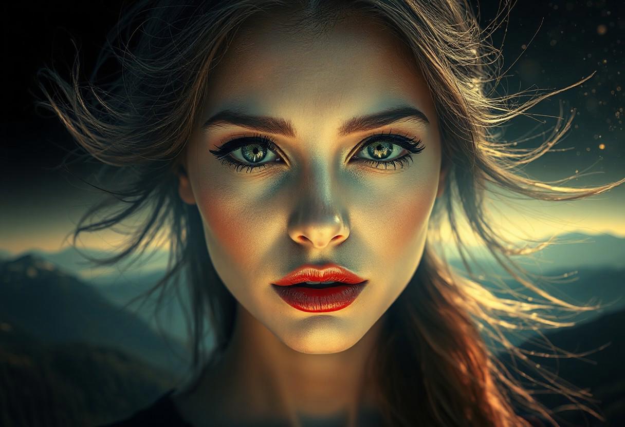 ((Fairytale optical illusion)) of an ideally beautiful young woman-supermodel of European appearance, close-up. Her mysterious penetrating look is full of mystery, ((elegant refined facial features)), very large very plump full lips, expressive bright eyes with thick eyelashes, her thick shiny hair flutters in the wind. Her airy transparent image hovers over a beautiful mountain-forest landscape under a black sky with bright shimmering particles, creating a sense of depth and immensity, creating a fabulous mystical atmosphere. ((Eccentricity)). (Epic Masterpiece), Hyper-realistic staged cinematic character rendering, hyper-realistic, hyper-detailed, ((Photorealism)), extremely high resolution, Best professional face lighting, 16k UHD, HDR.