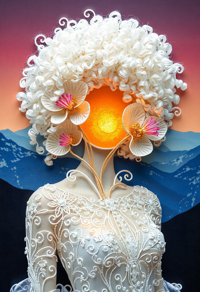 Resin wire art flower bloom. Curly-haired white albino woman. Elaborate filigree gala gown. Mountainous sunrise.