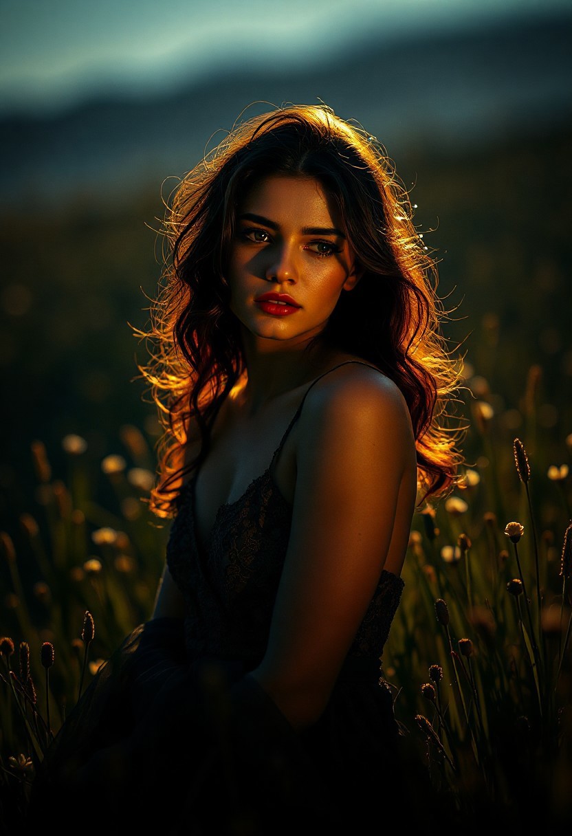 Photography by Philippe Halsman and Huda Lutfi. A beautiful woman poses on a dark luminescent meadow with shadow art. Alluring, 8K, UHD, masterpiece, highly detailed, delicate details, realistic, perfect composition, natural light, cinematic. Radiating irresistible charm from head to toe. Octane render, trending on Artstation.