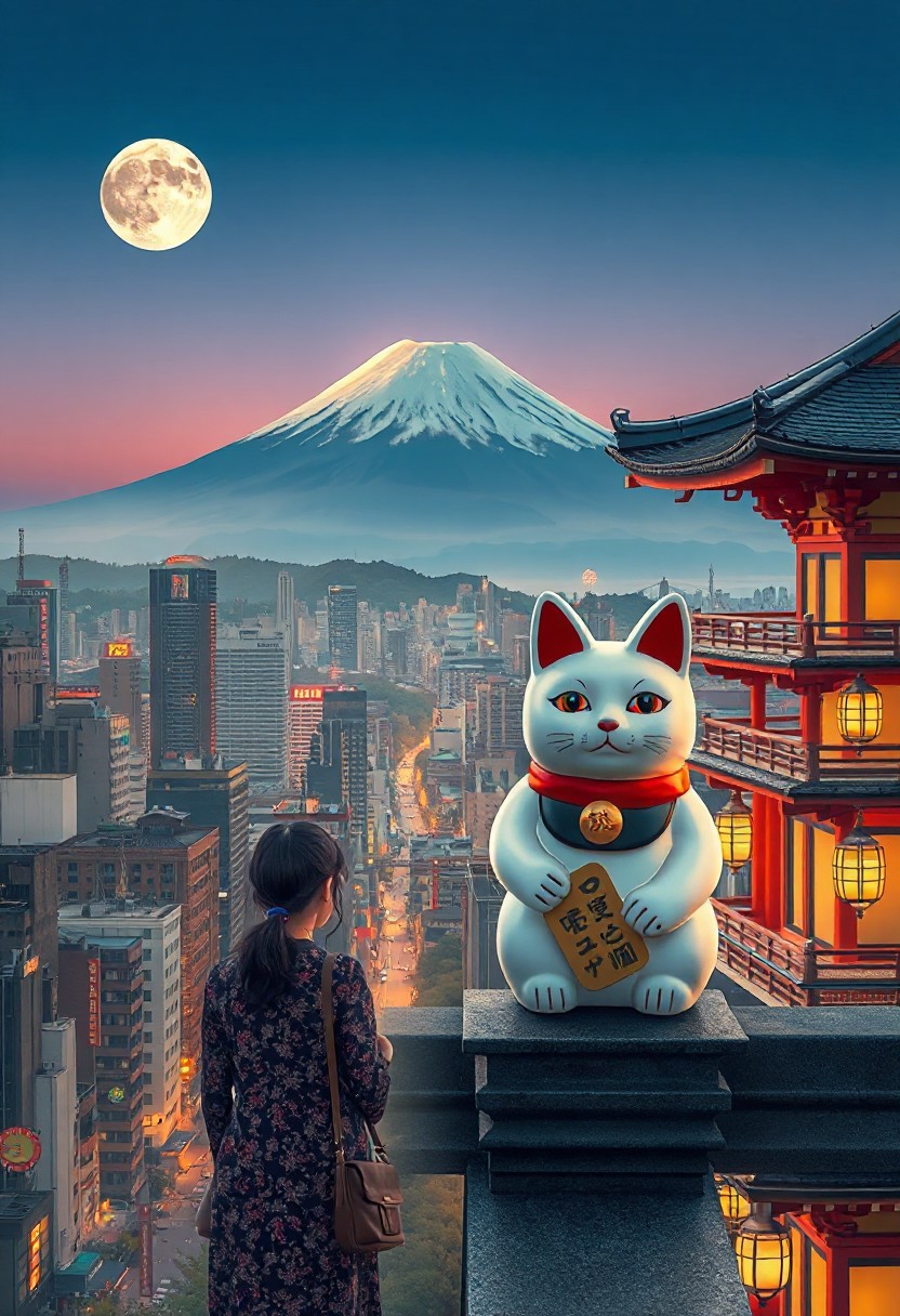 japanese city beautiful landscape, noon, woman, very intricate, very detailed, sharp, bright, colorful, mt fuji, tokyo, maneki neko watching from the roof of a building,
