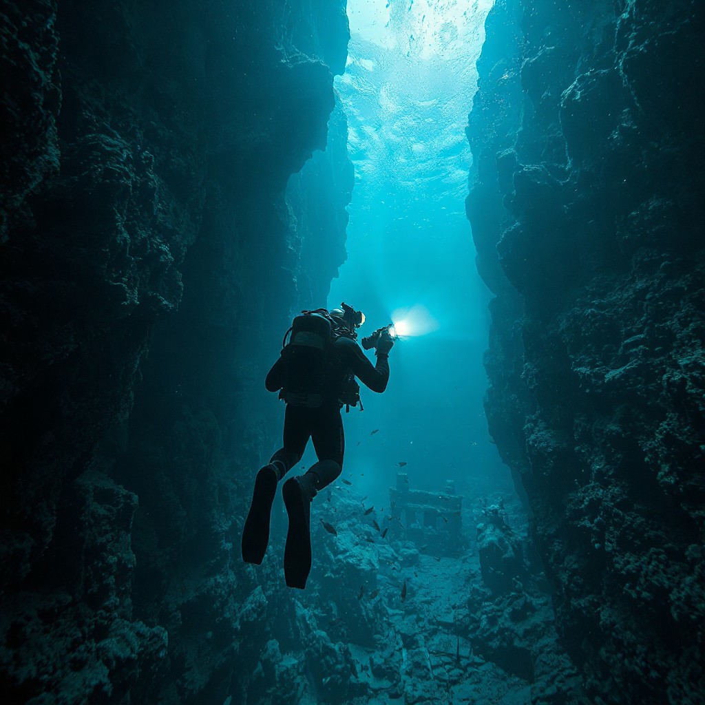 *"A breathtaking deep-sea abyss scene, with two massive rocky walls covered in bioluminescent coral and strange underwater flora. The camera angle is positioned above the diver, looking down as he explores the dark depths. The diver, wearing a high-tech deep-sea suit with glowing blue accents, holds a rugged underwater camera in one hand, filming the mysterious abyss. In his other hand, he grips a powerful flashlight, its bright beam cutting through the inky darkness, revealing eerie shadows and ancient ruins scattered along the ocean floor. Schools of alien-like fish dart away from the light, while strange, translucent jellyfish float in the distance. The water is thick with particles, creating a dreamy, cinematic atmosphere. The scene is dark, moody, and mysterious, with dramatic lighting from the diver’s flashlight casting long, haunting shadows. Ultra-detailed, photorealistic, 8K, cinematic underwater shot."*