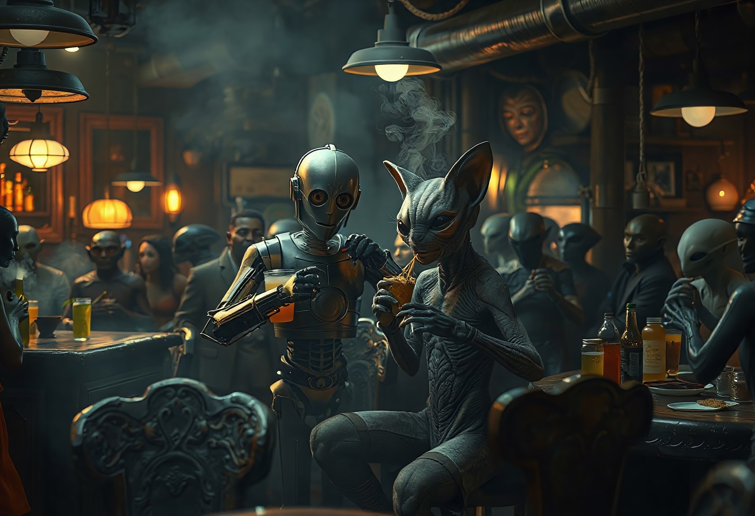 A dimly lit, gritty Star Wars-style tavern packed with various alien species. At the center, an old, matte gray humanoid robot resembling C-3PO is carefully cutting the hair of a humanoid feline alien — the alien has expressive cat-like features, fur, and is calmly eating noodles and sipping a glowing drink. The environment is full of energy: aliens dancing, smoking, drinking; lively and chaotic. The tavern features worn, carved wooden chairs and tables, a heavily rusted metallic bar stacked with colorful alien drinks, bottles, and snacks. Dust floats in the air, soft volumetric light from overhead lamps, subtle smoke and haze. DSLR quality, 50mm lens, shallow depth of field, natural light diffusion, cinematic contrast, ultra-realistic details, subtle motion blur on dancing figures.