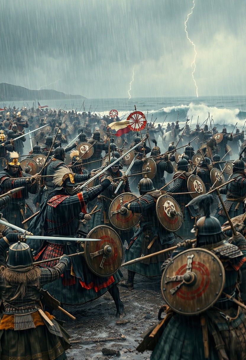 A vivid, cinematic battle on a stormy coastal plain, showing adult Japanese samurai clashing with adult Mongolian warriors in a 13th-century conflict. Rain lashes the scene as warriors engage in intense combat, with ocean waves crashing and distant ranks fading into mist. The atmosphere is chaotic and richly detailed. Japanese Samurai: Elite samurai, all mature warriors, wield katana and naginata, blades gleaming. Ashigaru spearmen, also adults, form disciplined ranks with yari spears. Samurai wear o-yoroi armor: lacquered iron plates in crimson and black, tied with silk cords, paired with kabuto helmets featuring gold crests and protective menpo masks. Ashigaru wear simpler do-maru armor in muted greens. Tate shields display white clan mon. Weapons include tachi swords, tanto daggers, and yumi bows. Colors are crimson, black, and gold, with blue-white silk sashes billowing. Mongolian Warriors: Adult Mongol horse archers fire composite bows, while infantry brandish curved sabers and maces. They wear lamellar armor of iron and leather in browns and blues, with conical helmets topped with horsehair plumes. Round shields bear red-black tribal patterns. Cavalry wear fur-lined vests and felt boots. Weapons include short spears and handaxes. Colors are brown, blue, and red, with embroidered saddlecloths. Stormy skies and lightning highlight wet armor. Mud and battle scars add realism.