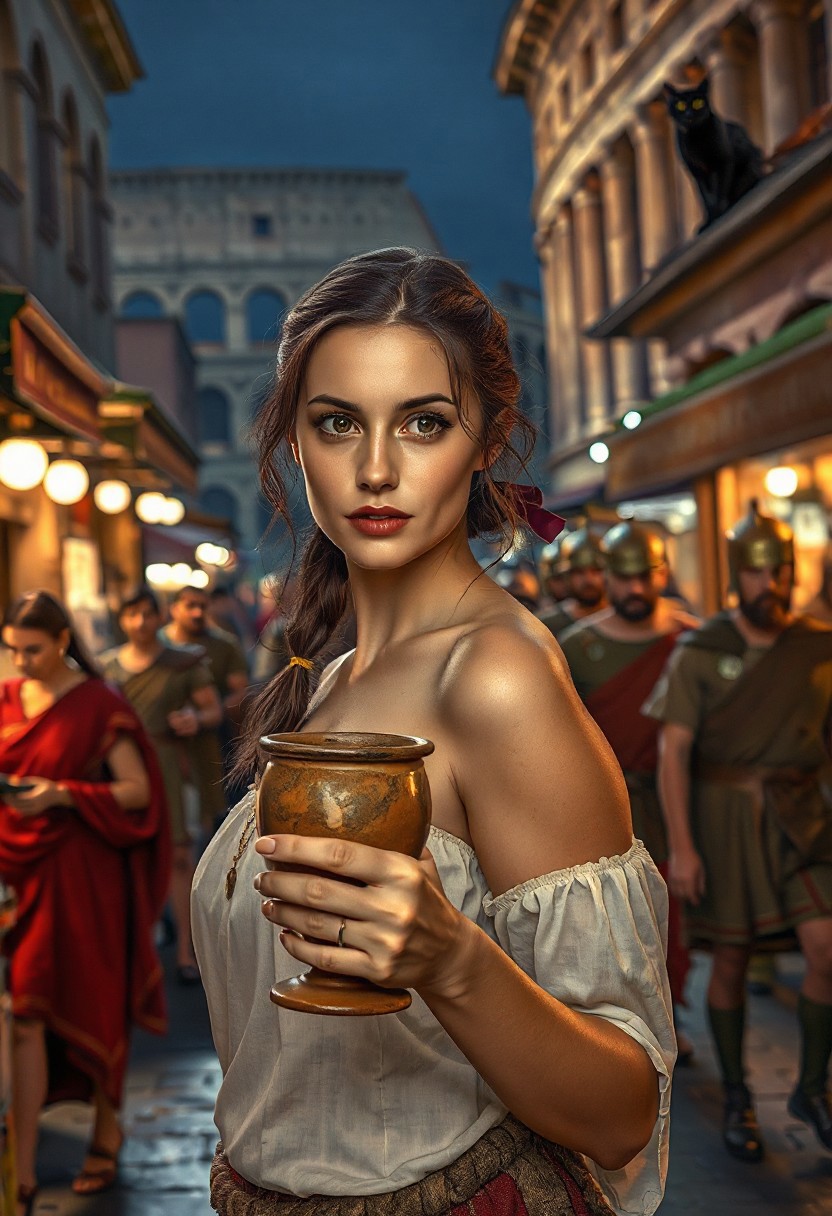 Setting is a 1st century Roman Empire market in Rome at night, the market is comprised of street vendors selling, food, weapons, and clothing. Everyone and everything in the image is appropriate for a scene from Ancient Rome, People wearing Roman clothing are walking through the street market shopping and eating, in the foreground is a merchant selling beverages and food at a market kiosk, (((a beautiful woman, 24 years old is standing in the foreground, the woman facing the viewer with a clay goblet of wine in her hand. Her eyes are beautiful and focused on the viewer, she has an expression of interested curiosity))), Roman Soldiers are walking behind the beautiful woman, one of the solders turns to look at the beautiful woman, many people are walking by in the busy street market, the woman is dressed in high fashion Roman Empire clothing with an alluringly sexual, but traditional roman aesthetic. The woman's hair is elegantly tied up with a ribbon. Artistic ancient Roman aesthetic, dynamic perspective, (((overall architectural aesthetic is Ancient Rome in 1st Century Roman Empire era))). Epic image that elicits a feeling of wonder and awe, Rome Coliseum Roman Forum architecture in background, a sleek black cat is visible sitting on a kiosk roof in the background,
