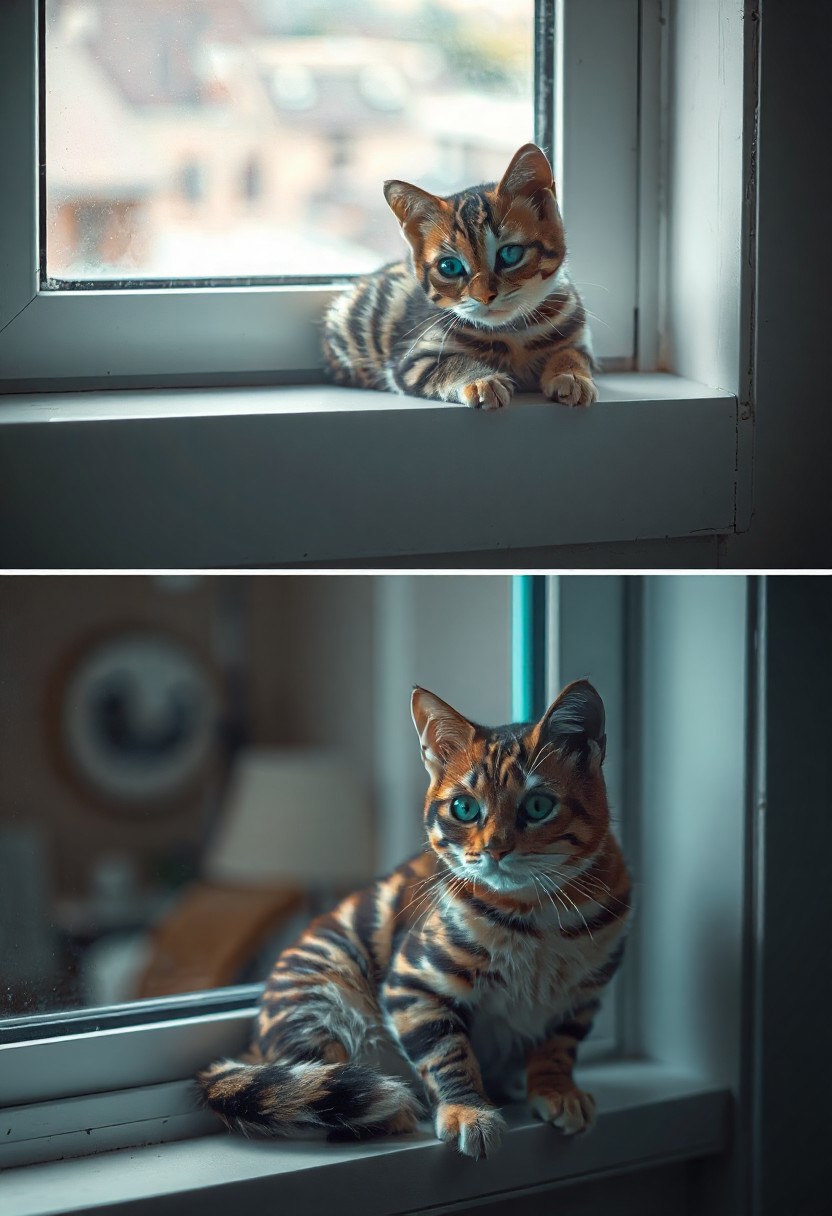 JNANX,luminous white silhouette,cyan glow,emerald highlights,flickering outline,dreamlike movement, "Generate a photorealistic image depicting two distinct stages of a tabby cat's life, shown in a diptych format. The top panel should feature a very young tabby kitten, small in size, with characteristic brown and black stripes. The kitten is lying comfortably on a white windowsill, its head turned slightly towards the viewer with an expression of curiosity or mild interest. The background visible through the window should be slightly blurred, suggesting an outdoor urban or suburban scene with muted colors of buildings and hints of greenery. The lighting in the top panel should be soft and natural, illuminating the kitten gently. The bottom panel should portray the same tabby cat, now significantly older and larger, in a similar pose on the same white windowsill. The background visible through the window in the bottom panel should match the top, maintaining continuity. The lighting should also be consistent, suggesting the passage of time but the same environment. The overall mood should evoke a sense of growth and the familiar comfort of a favorite resting spot. Ensure the texture of the cat's fur is detailed and realistic in both panels, highlighting the difference between the soft, downy fur of the kitten and the sleeker coat of the adult cat."